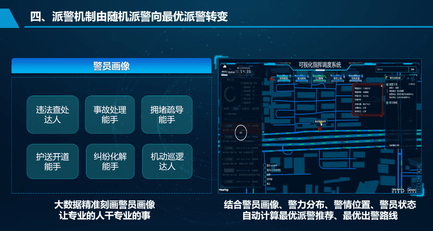 解决计划:世纪高通依托海量数据优势 ,运用大数据画像手艺为民警绘制警员画像 ,例如:通俗事故处置惩罚能手、重大事故处置惩罚能手、拥堵疏导能手等。指挥中心凭证警员画像 ,团结警力漫衍、事务位置、警员状态等多个维度 ,天生最优派警模子(手艺最优、路径最优) ,让专业的人干专业的事。